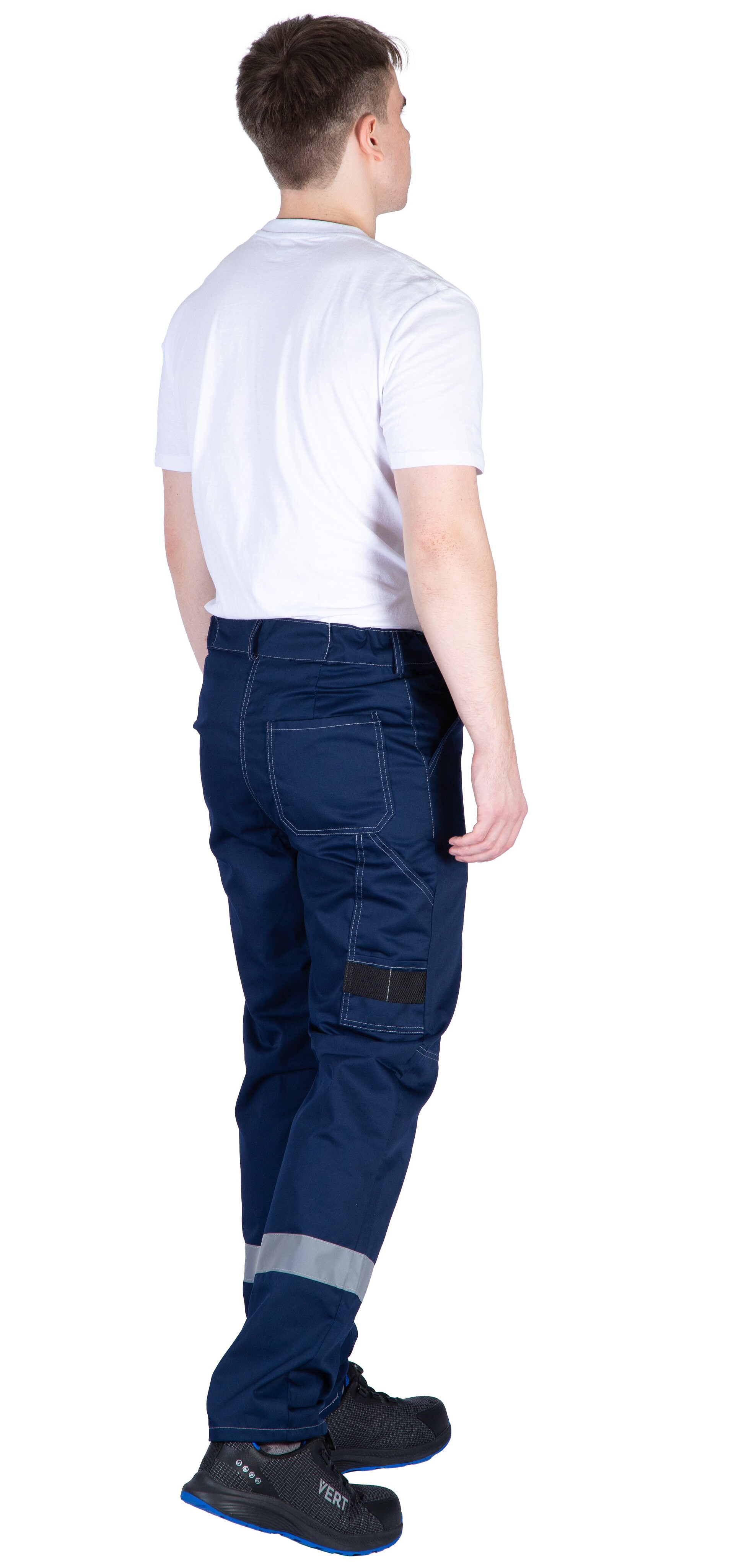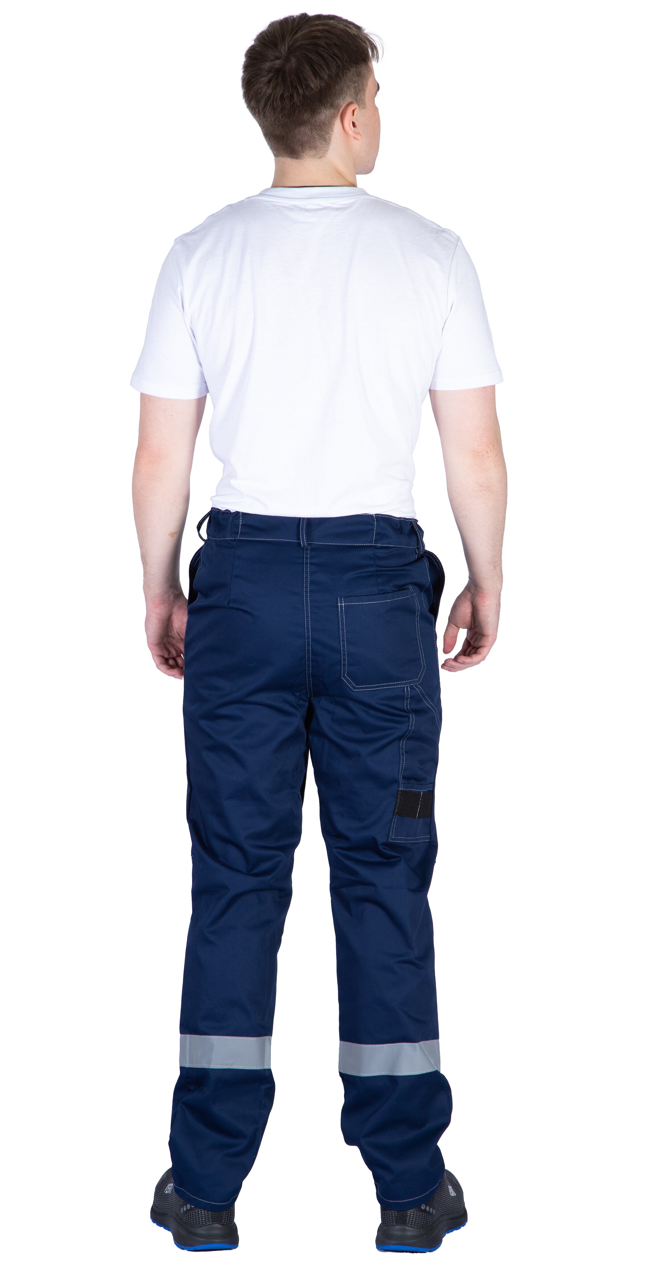 Брюки с УСИЛЕННЫМИ НАКОЛЕННИКАМИ, защищающими от истирания, с накладными карманами сзади и сбоку с карманом для инструмента. По бокам эластичная тесьма по талии. Световозвращающие полосы шириной 50 мм по низу брюк обеспечивают хорошую видимость в ночное время и в условиях недостаточной видимости.