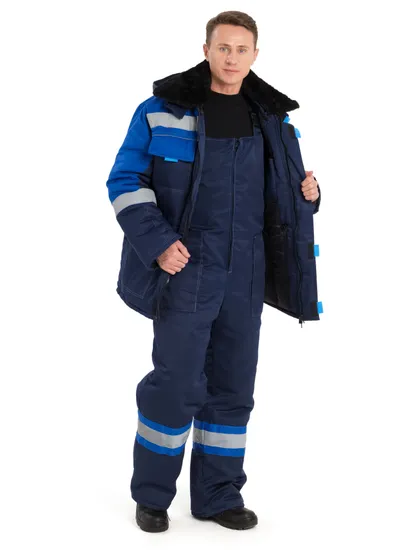 Костюм состоит из куртки и полукомбинезона. Куртка со световозвращающими полосами, с центральной бортовой застежкой на молнию, с ветрозащитным клапаном на липучках. Вместительные утепленные нагрудные и боковые карманы защищены клапанами на липучках. Рукав прямой с трикотажной манжетой. Куртка со съемным меховым воротником на пуговицах и съемным капюшоном на кнопках. Объем талии регулируется кулисой со шнуром.