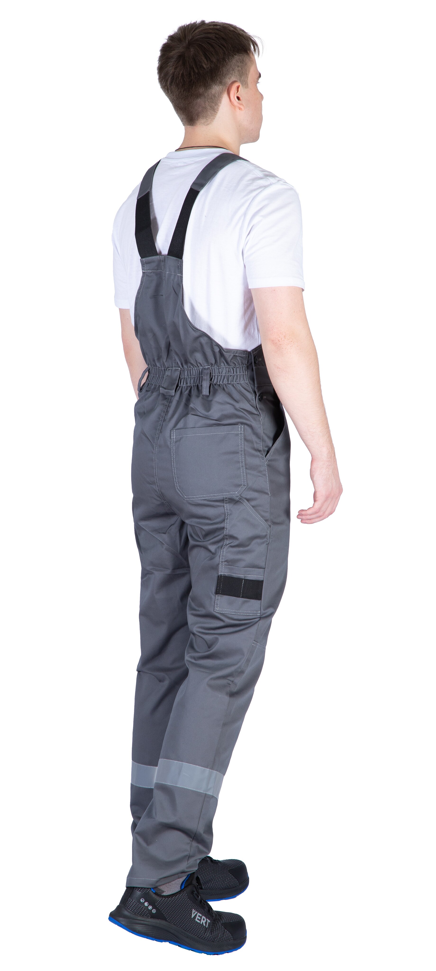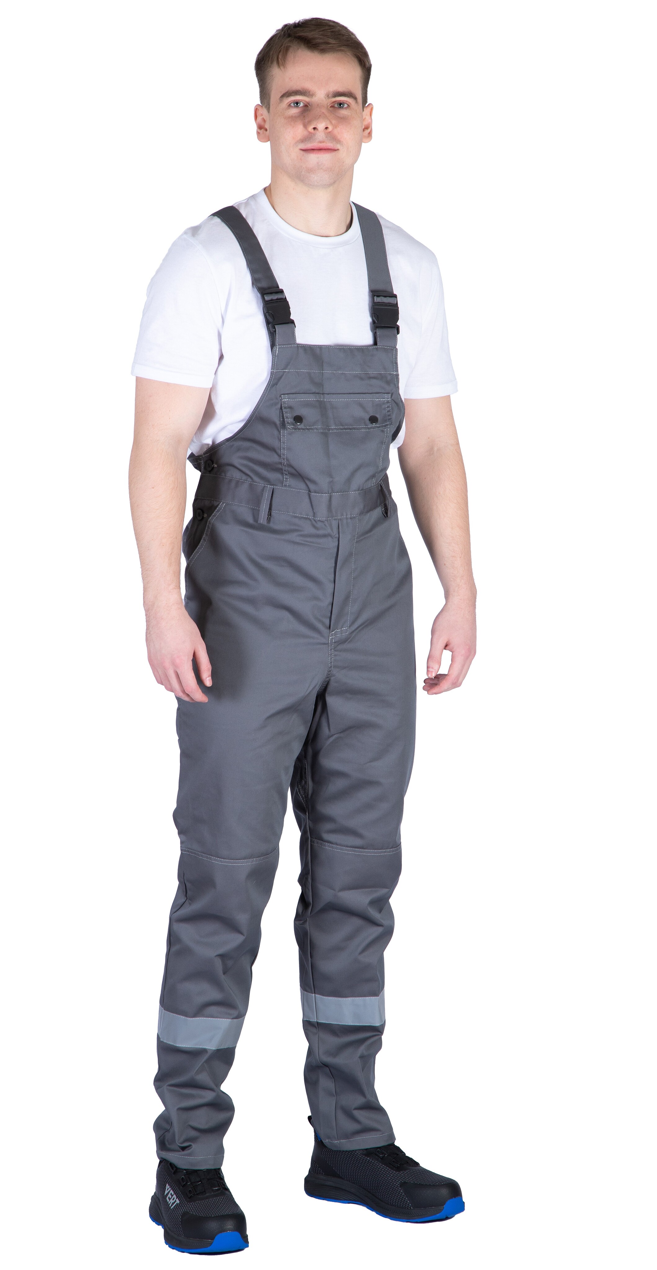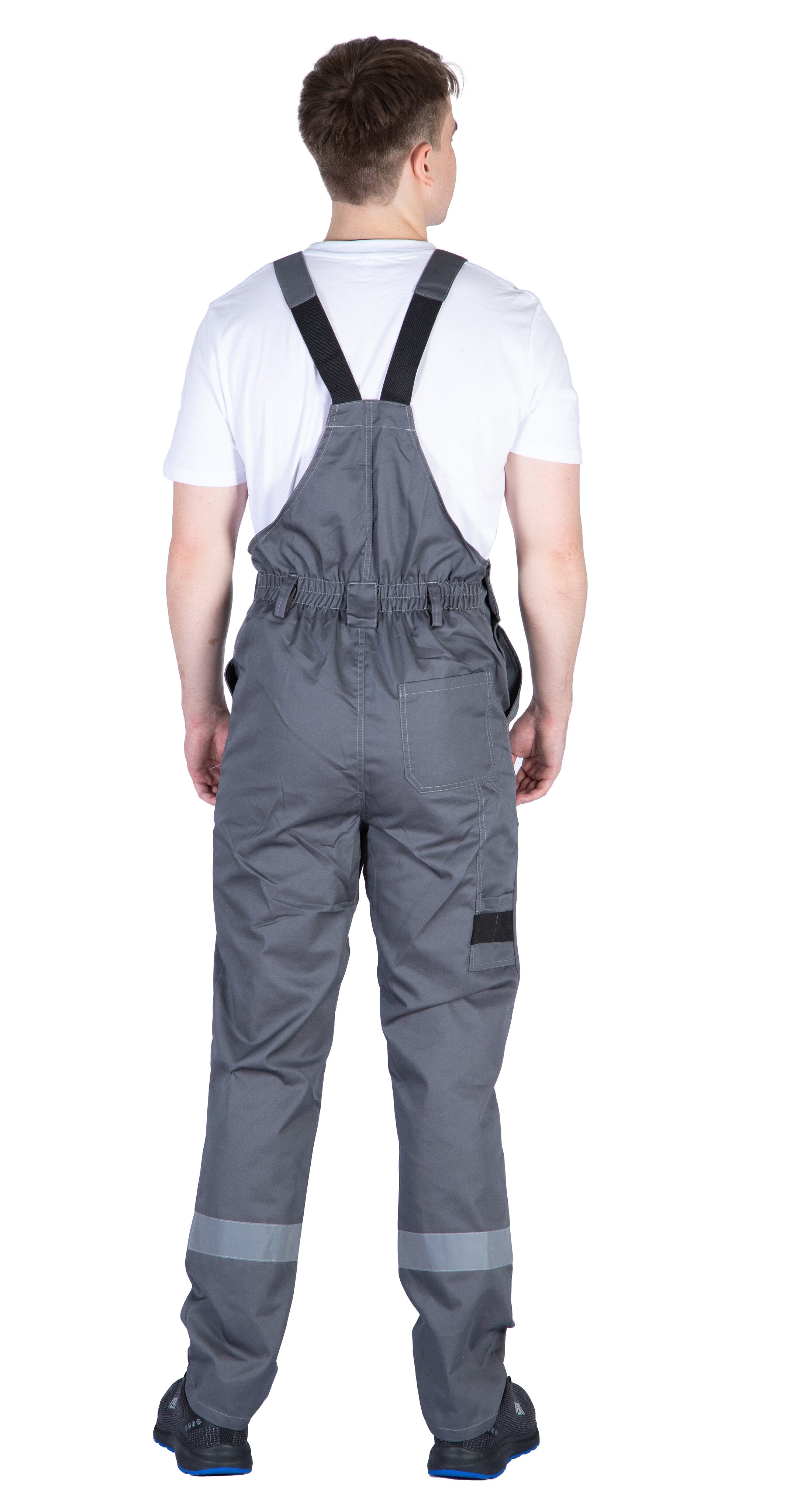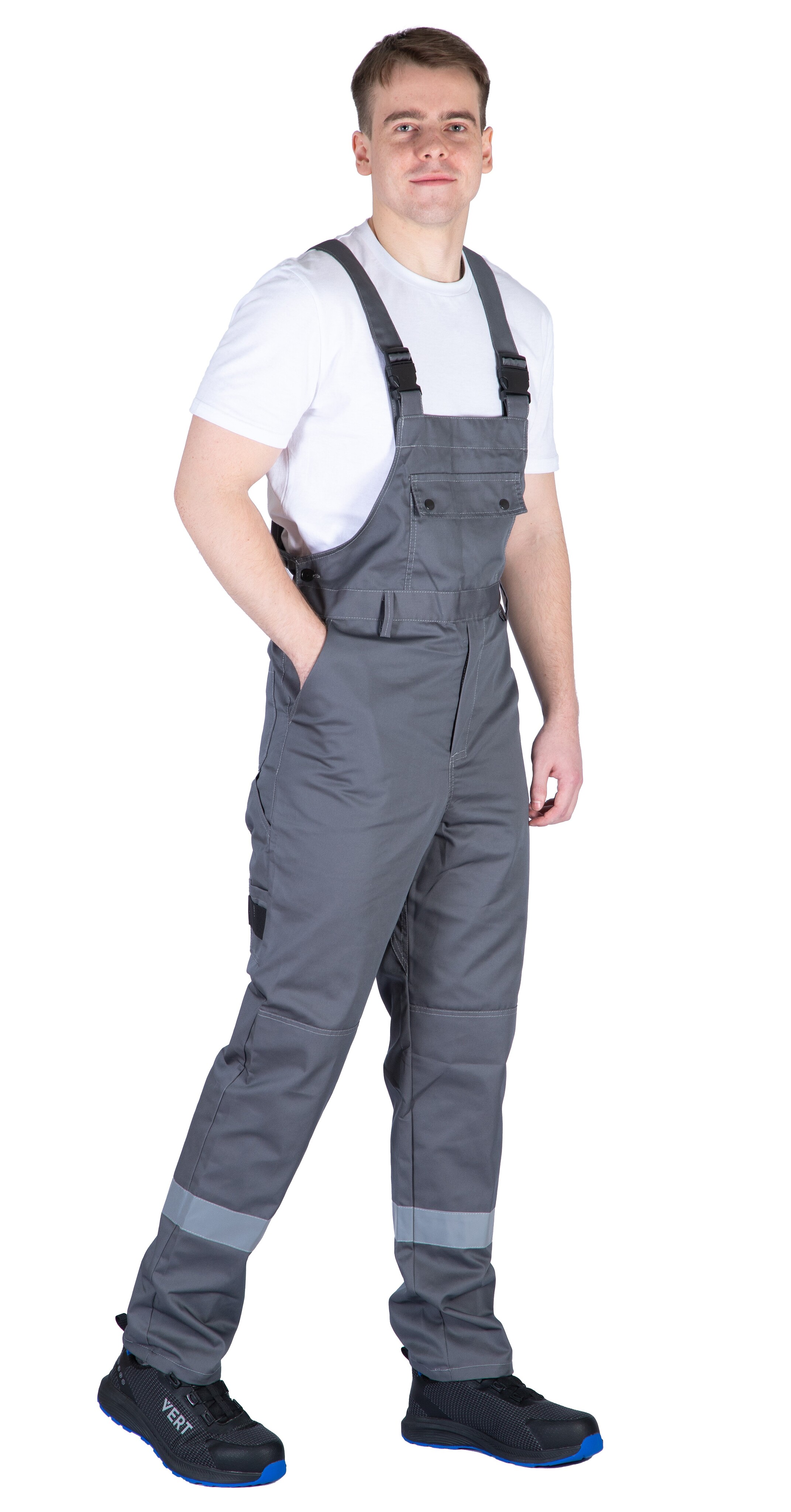 Полукомбинезон с УСИЛЕННЫМИ НАКОЛЕННИКАМИ, защищающими от истирания, с многофункциональным нагрудным карманом с застежкой на кнопки и накладными карманами сзади и сбоку с карманом для инструмента. Сзади эластичная тесьма по талии. Бретели регулируются по длине. Световозвращающие полосы шириной 50 мм по низу брюк обеспечивают хорошую видимость в ночное время и в условиях недостаточной видимости.
